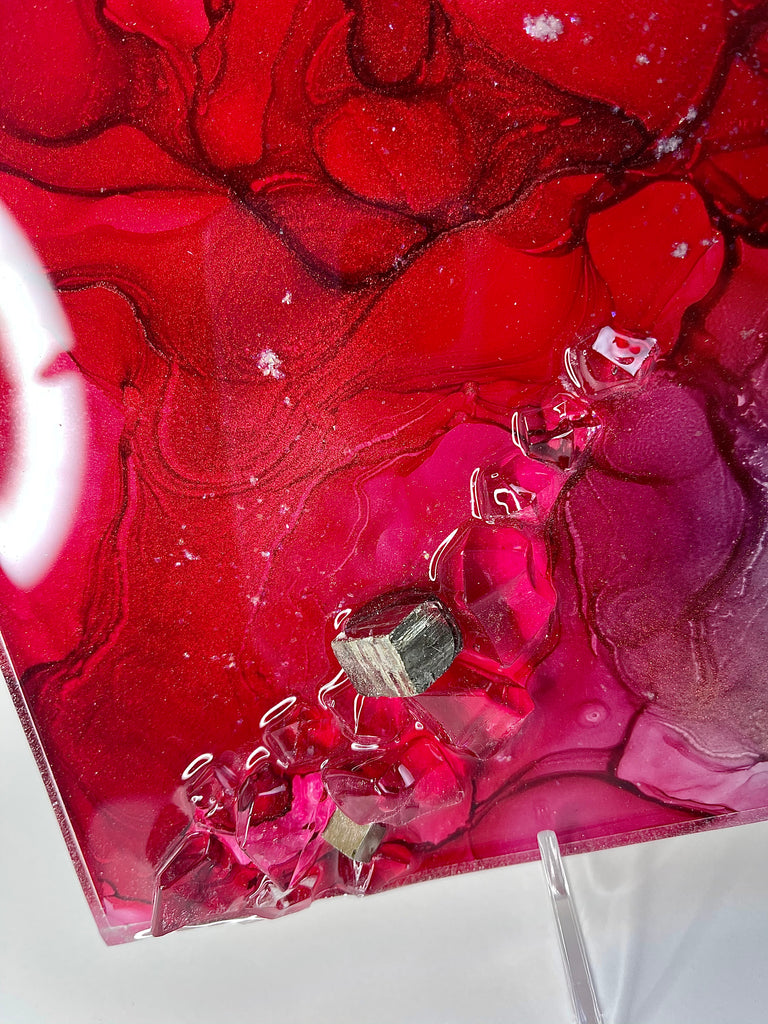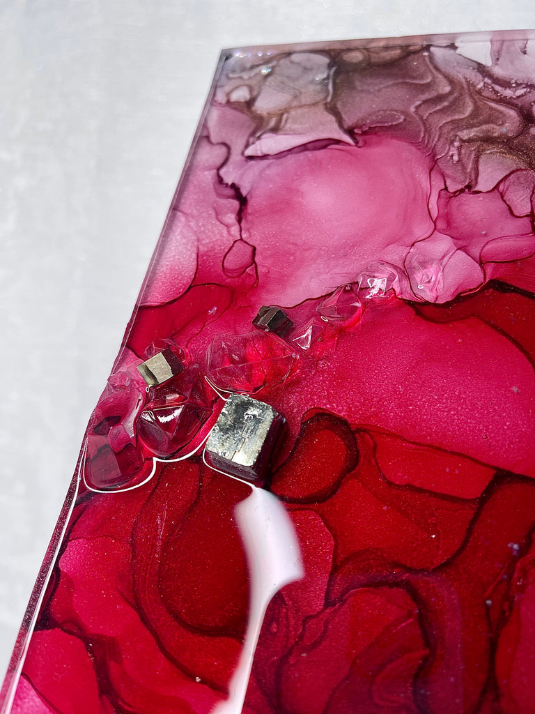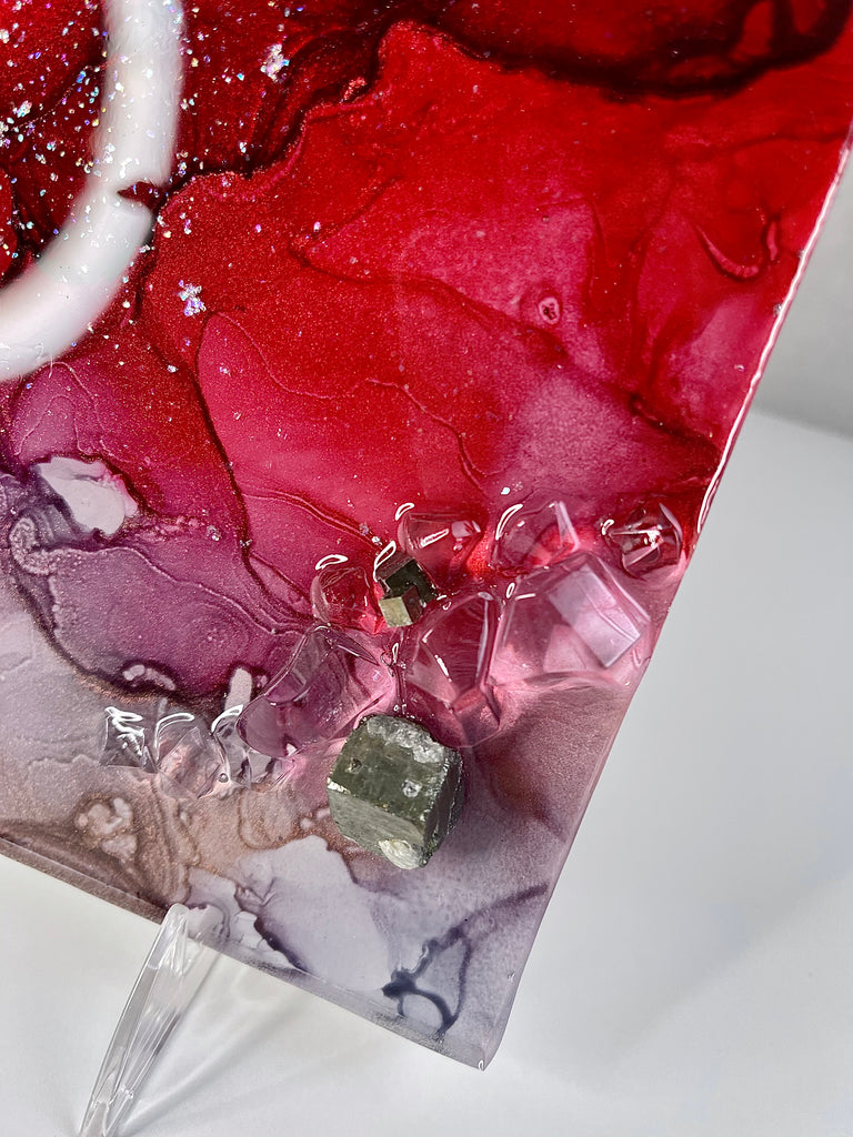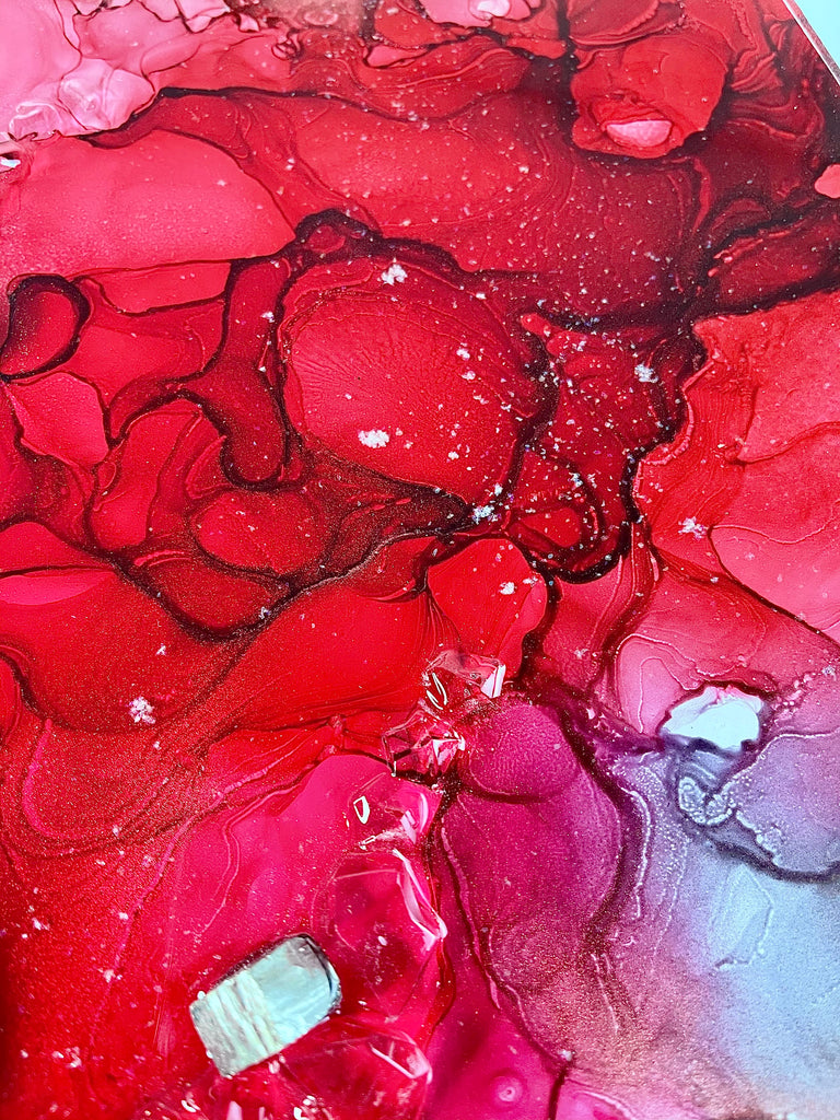 Details: This one of a kind original piece was made by mounting a painting on yupo paper to a wooden board, sealing with several coats of resin, and adding 3D embellishments. Mixed-media embellishments include faux crystals, mica, glitter, and microbeads.