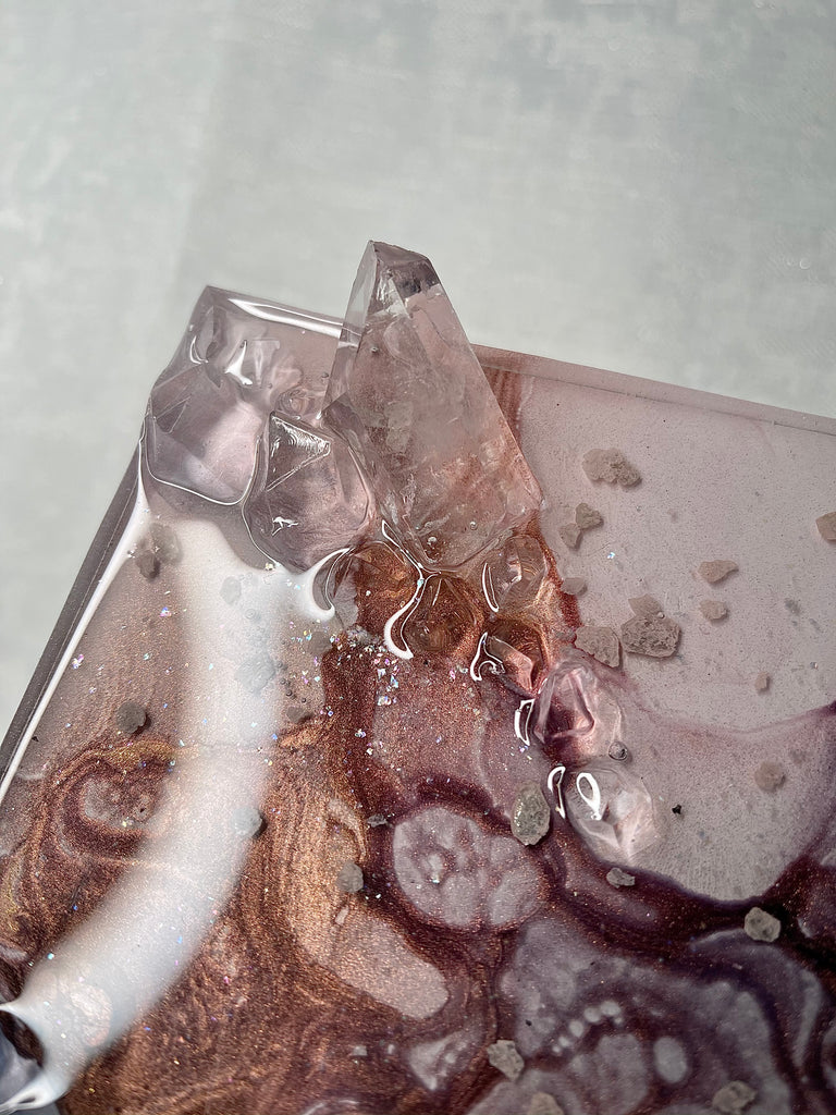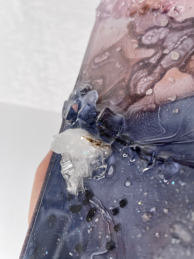 Details: This one of a kind original piece was made by mounting a painting on yupo paper to a wooden board, sealing with several coats of resin, and adding 3D embellishments. Mixed-media embellishments include faux crystals, mica, glitter, and microbeads.