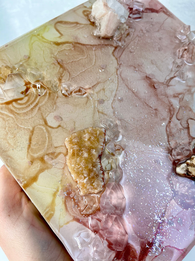 Details: This one of a kind original piece was made by mounting a painting on yupo paper to a wooden board, sealing with several coats of resin, and adding 3D embellishments. Mixed-media embellishments include faux crystals, mica, glitter, and microbeads.