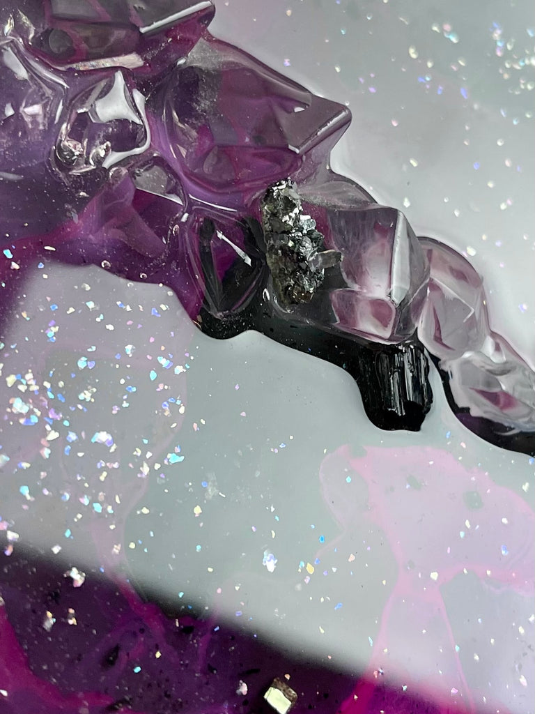 Details: This one of a kind original piece was made by mounting a painting on yupo paper to a wooden board, sealing with several coats of resin, and adding 3D embellishments. Mixed-media embellishments include faux crystals, mica, glitter, and microbeads.